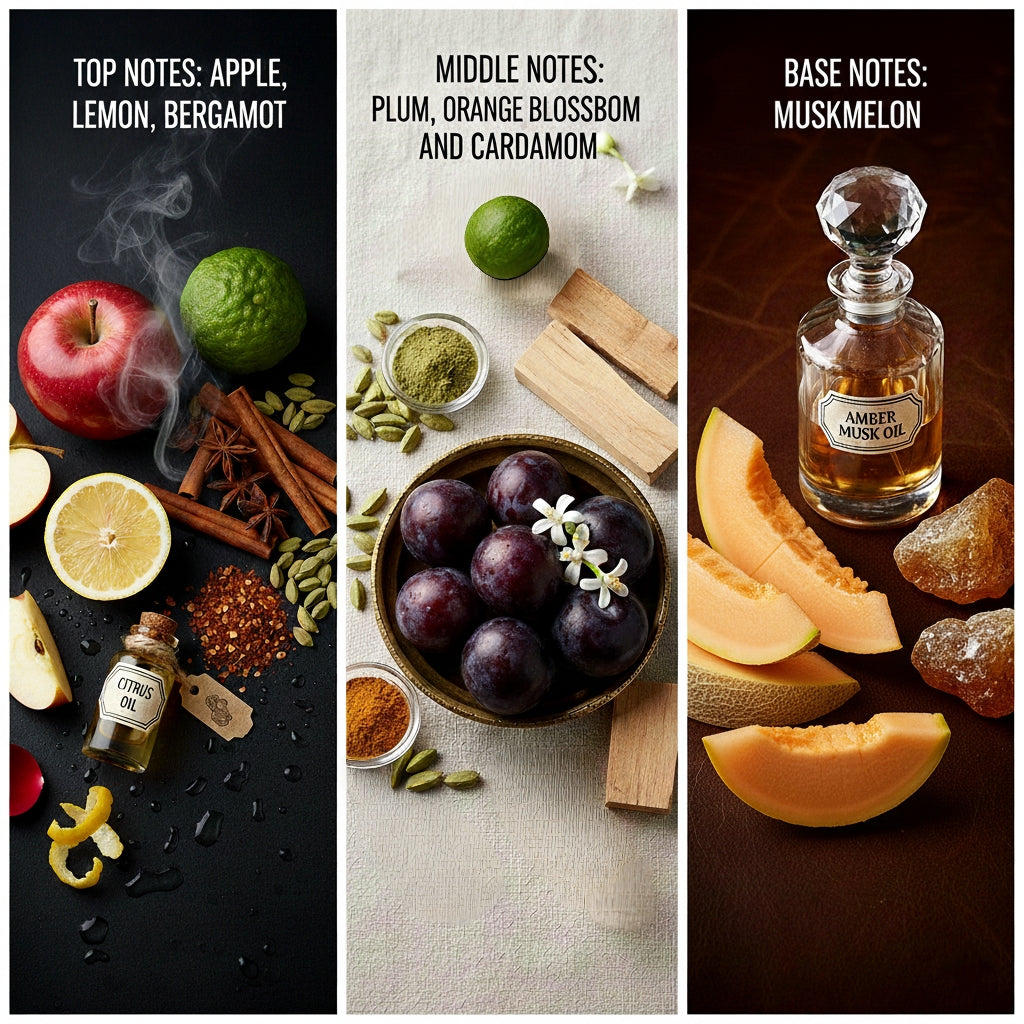 It opens with a vibrant burst of crisp apple, zesty lemon, and sparkling bergamot, creating an uplifting and energetic first impression. As the fragrance unfolds, the heart reveals a smooth blend of juicy plum and delicate orange blossom, enriched with the warm, aromatic touch of cardamom, adding subtle spice and intrigue.